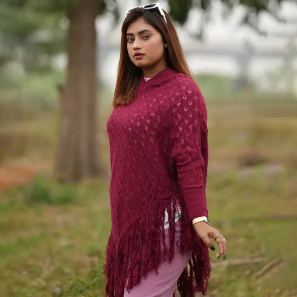 Wrap yourself in cozy elegance with this maroon knitted poncho, designed for effortless style and warmth. Featuring a beautiful open-knit diamond pattern, soft ribbed sleeves, and stylish fringed edges, this poncho is the perfect statement layer for chilly days. Its flowy design flatters all body types while keeping you snug and fashionable — ideal for pairing with jeans, trousers, or dresses.